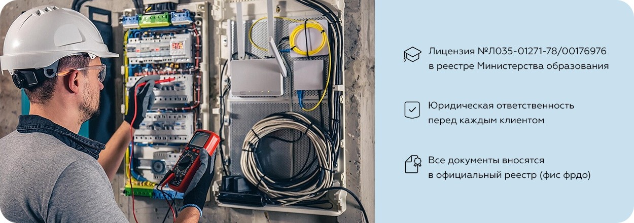 Наш техникум предлагает курсы электромонтера по ремонту и обслуживанию электрооборудования, в результате успешного освоения которых обучающимся обеспечено присвоение разряда специалиста и получение полного пакета документов, необходимых для ведения профессиональной деятельности, среди которых: